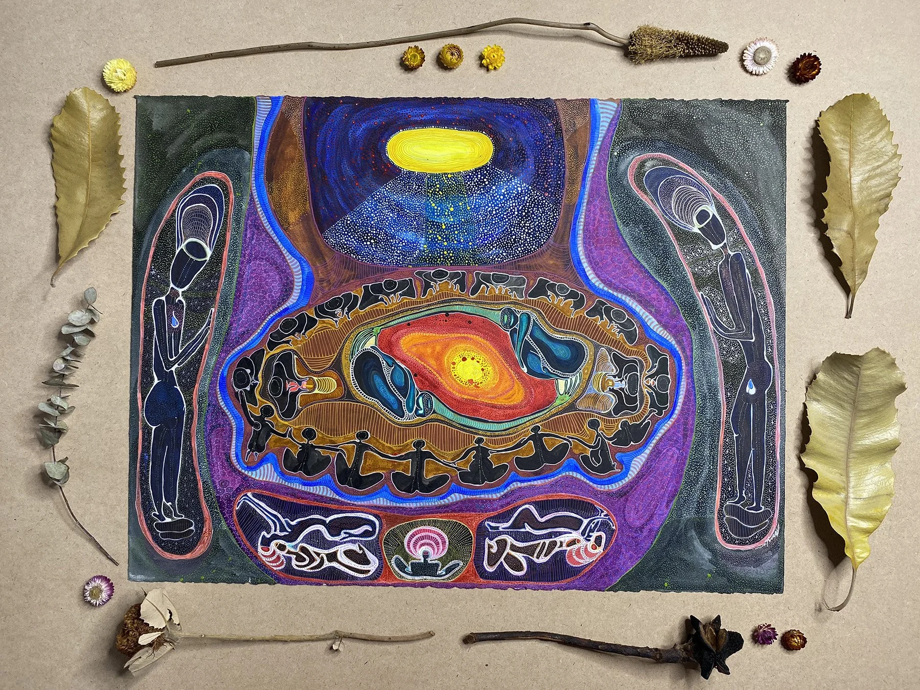 Watercolour paint, Sakura Pigma Micron Pens, and Metallic Ink on Watercolour Paper (300 GSM Rough Arches) Deckle Edge.